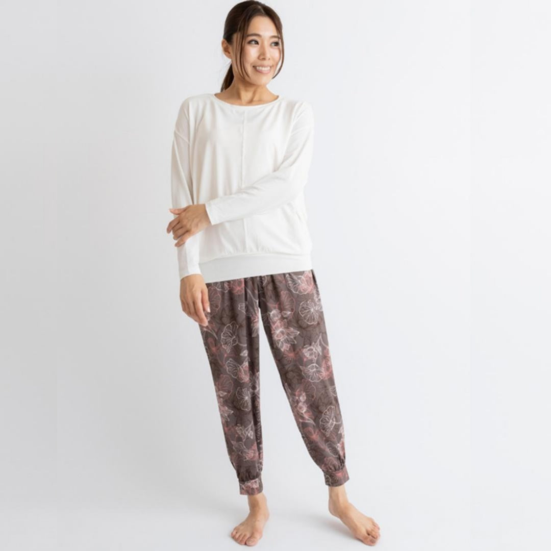 3色のロータスの花が重なり合う秋冬オリジナルプリントのパンツです。