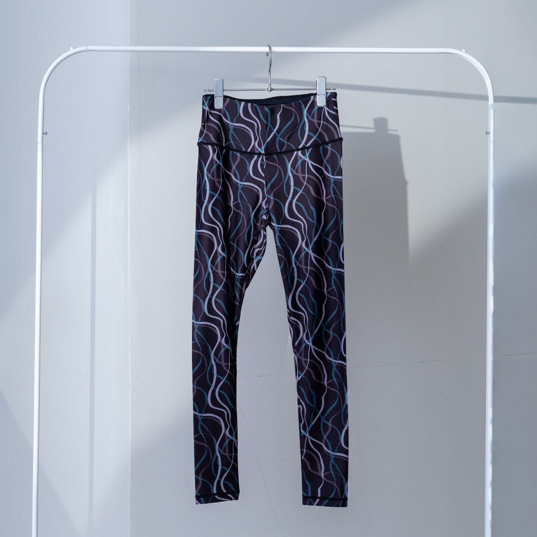 ひらひらと舞うリボン柄のオリジナルプリントのレギンスです。縦線が強調されるので、すっきりと見せてくれる視覚効果あり。