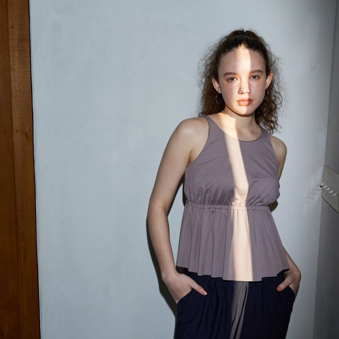 洗練された細いリブ生地がギャザーにゆれるペプラムタイプのヨガ・フィットネス用トップス