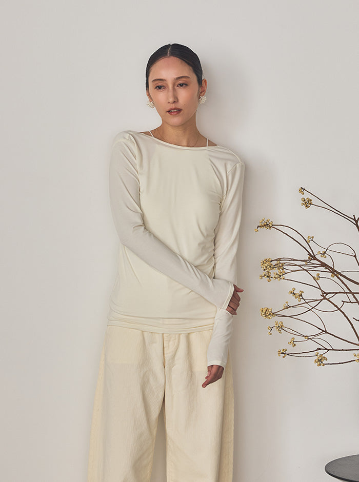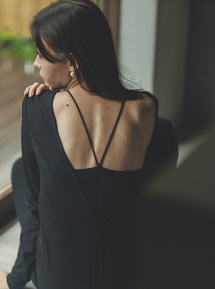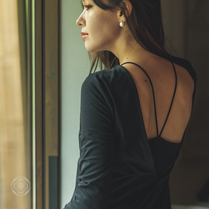 深すぎない絶妙な開きが、背中のラインを自然に美しく演出。