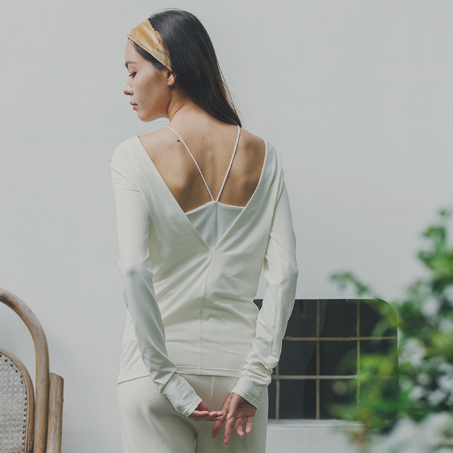 また、長袖でありながらバックオープンデザインで通気性が良く、寒い時期のウォーミングアップはもちろん、ホットヨガや夏の冷房対策にも活躍するオールシーズン対応の万能トップスです。