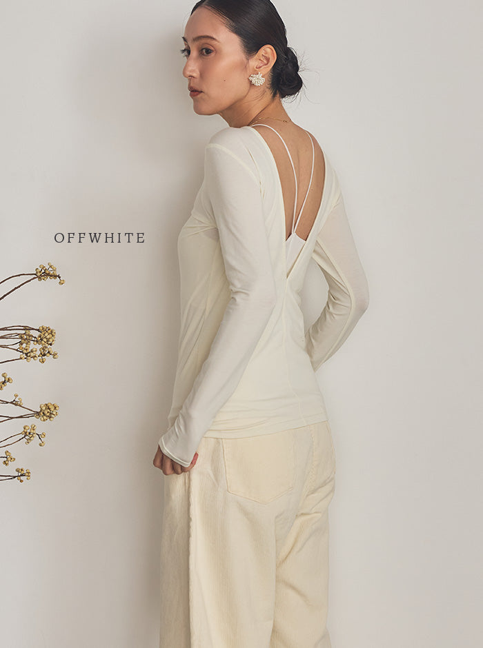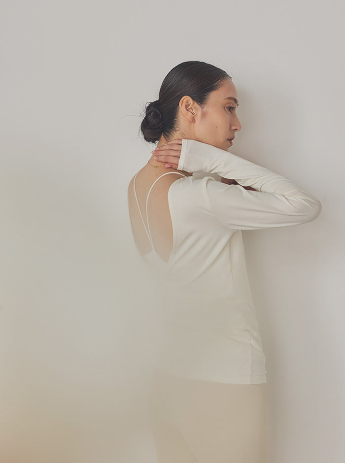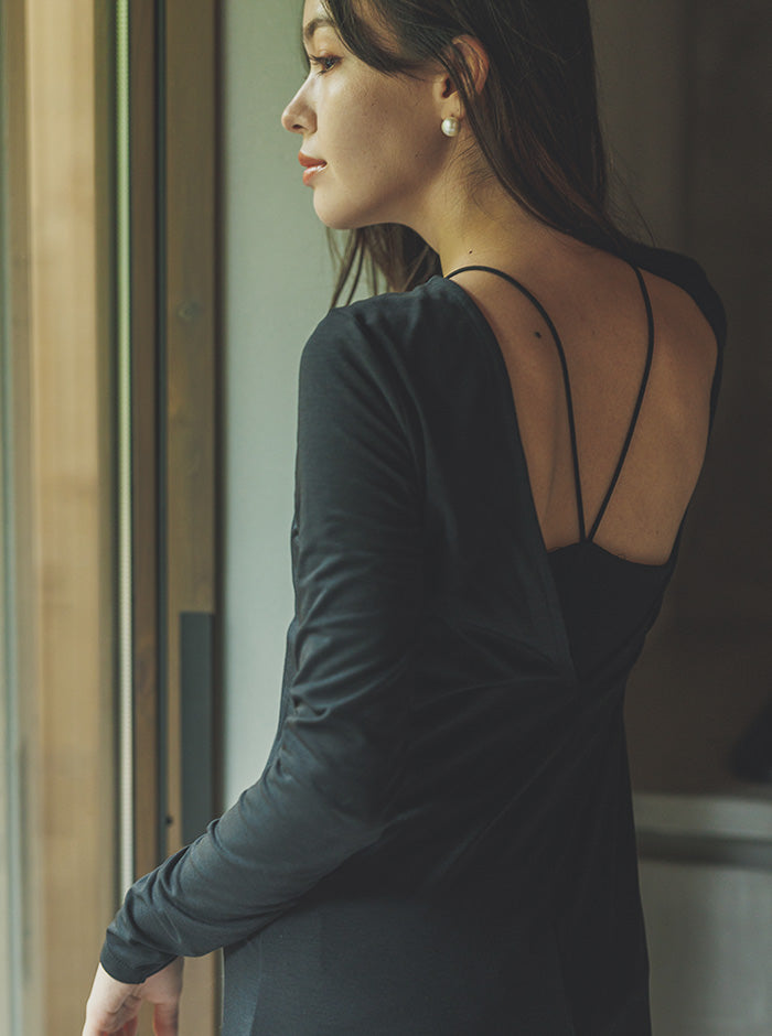 インナーとのレイヤードを楽しめる開放的な背中のカッティングは、ヘルシーな色気を漂わせます。