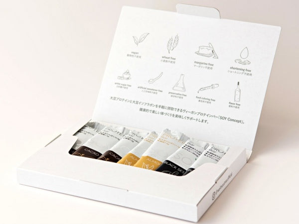 大豆プロテインと大豆イソフラボンを美味しく手軽に摂取できるヴィーガンプロテインバー「SOY Concept」のトライアル7本セット。カカオ3本/アーモンド2本/ブラックセサミ2本。