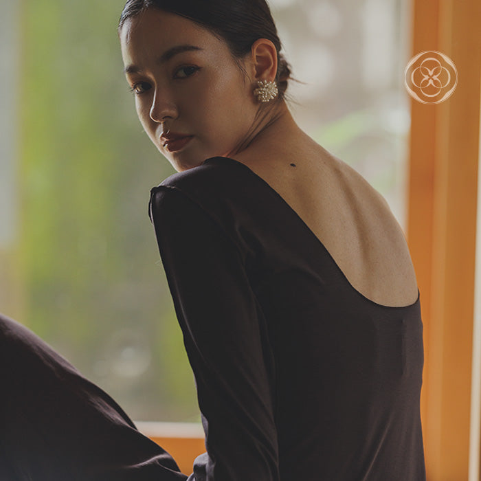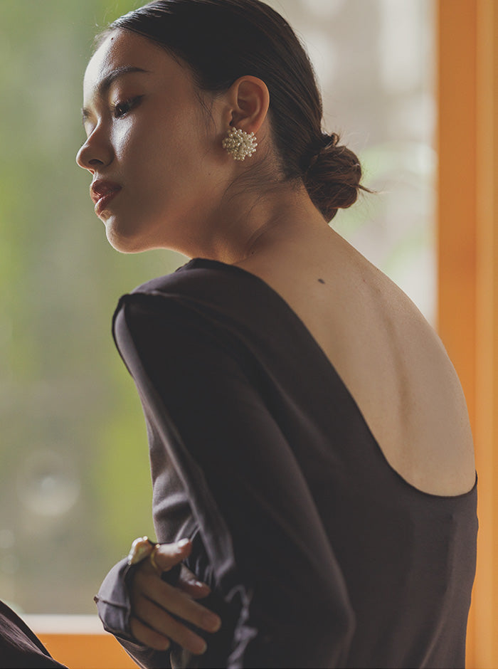 装飾を排したミニマルなデザインだからこそ、洗練された大人の女性の美背中を際立たせます。