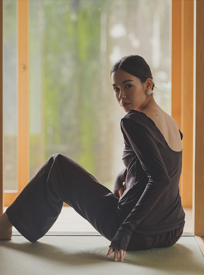 深めに開いたバックスタイルが、女性らしいしなやかなラインを引き立て、シンプルながらも印象的な着こなしを実現します。