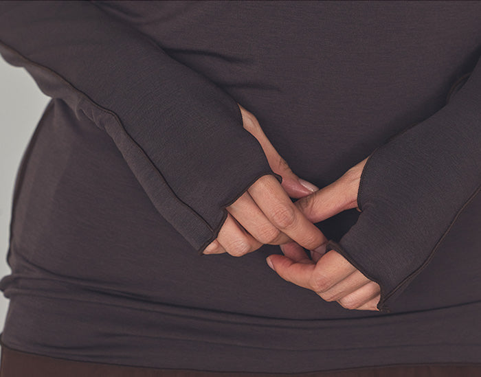 袖口には指を通せるサムホールを設け、モード感と機能性を両立。
